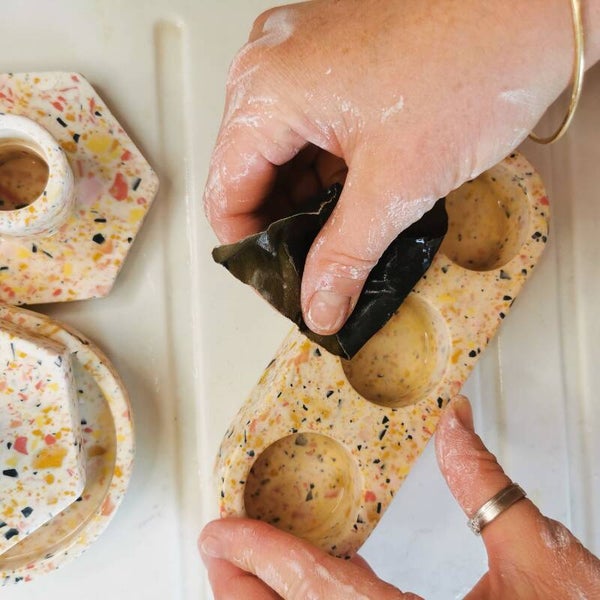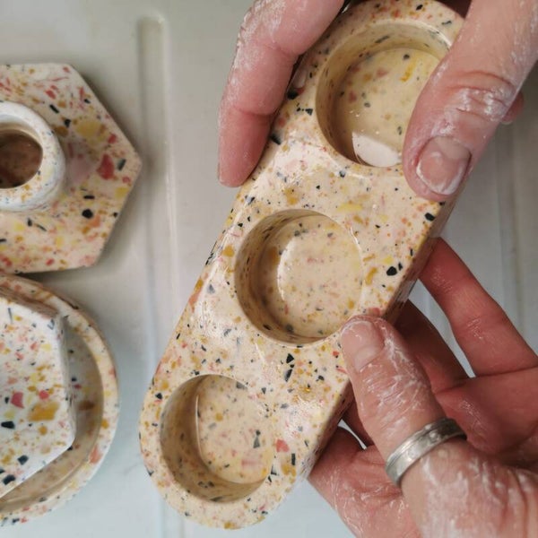 In this 2.5-hour workshop you will be taught step by step, with demonstrations on how to make your own pieces of home decor with Jesmonite using 3x techniques - terrazzo, marbling & colour block.